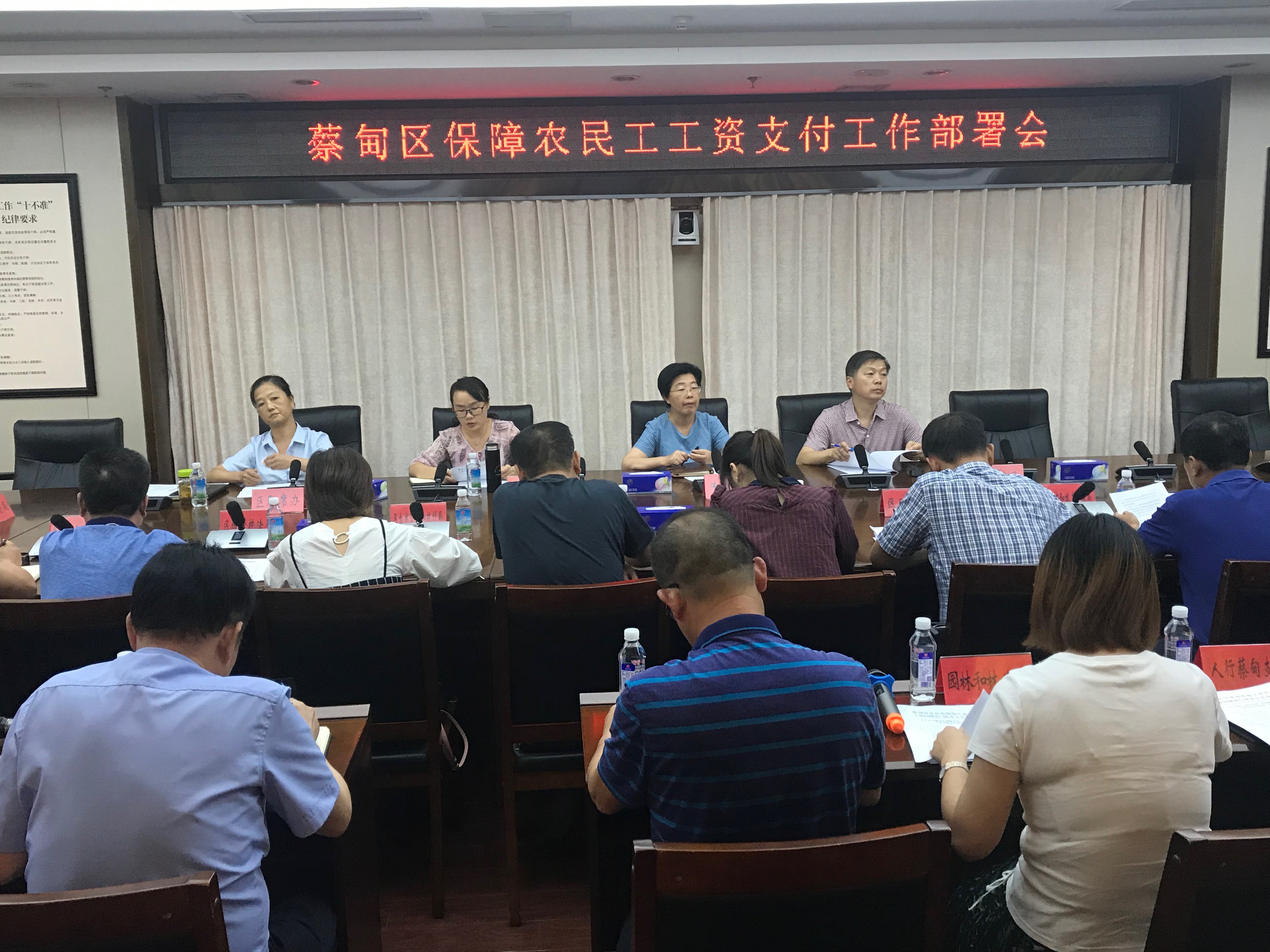 为迎接建国七十周年大庆和“七军会”等重大活动,切实保障农民工“劳有所得”和关键时期社会的和谐稳定,2019年8月29日,蔡甸区召开保障农民工工资支付工作部署会,会议由区人民政府办公室副主任黄芬主持会议,区治理拖欠农民工工资联席会议成员单位和承担“军运会”相关项目的主管单位分管负责人参加会议,联席会议召集人、区政府副区长朱义侠出席会议并讲话。