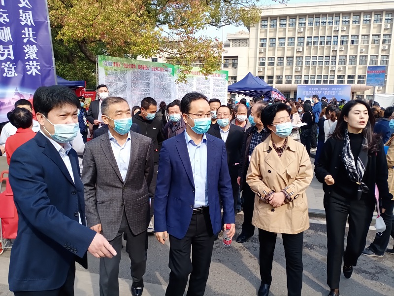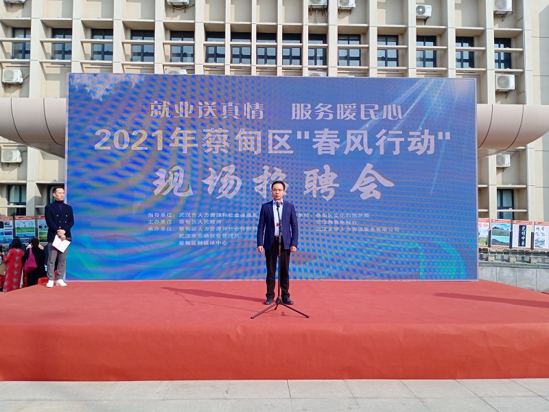 2月23日上午,蔡甸区文化艺术中心广场人头涌动,彩旗招展。蔡甸区2021年“春风行动”系列招聘活动首场现场招聘会正在举行。市委组织部副部长、市人社局局长孙志军,市人社局总会计师吴刚,市经信局副局长张红,蔡甸区人民政府区长郝胜勇等市区领导莅临招聘会现场并观摩了直播活动。此次招聘会设立宣讲推介区、政策咨询区、求职服务区和网络直播区,组织123家用人单位参加,提供10633个招聘岗位,在做好疫情防控的前提下,6500余人进场应聘,现场意向协议1636人。同时,通过蔡甸区新媒体、武汉教育电视台对美的集团武汉公司等7家企业进行了网络直播,在线观看浏览人员54.5万人。