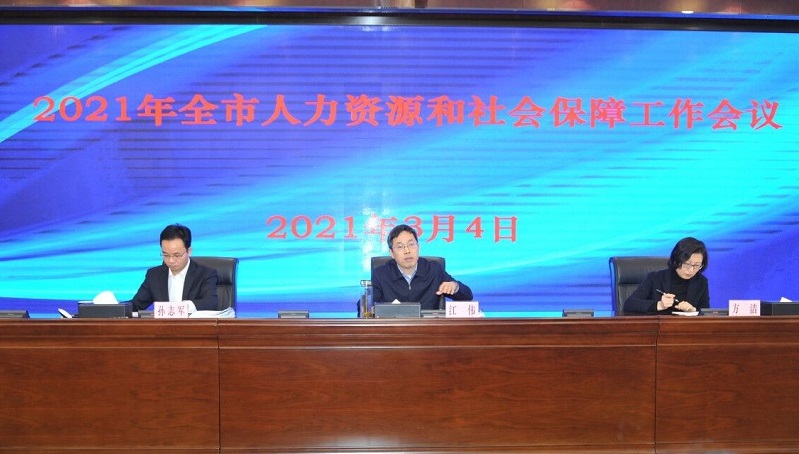 3月4日上午,2021年全市人力资源和社会保障工作会议在局机关12楼会议室召开,会议由市政府副秘书长方洁主持,江汉等5个区进行交流发言,市委组织部副部长、市人社局党组书记、局长孙志军作工作报告,市委常委、副市长江伟最后总结讲话。江伟副市长对全市人社系统2020年工作表示充分肯定,并对2021年工作提出具体要求。局领导,各区局主要负责人,派驻纪检监察组副组长,局机关各处室(局属各单位)主要负责人参会。
