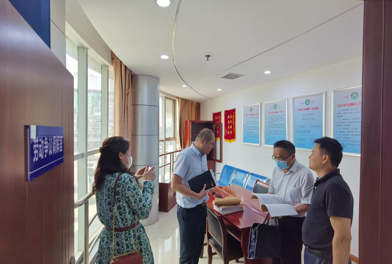 6月4日,武汉市人力资源和社会保障局仲裁院屈文峰处长,市总工会王瑛处长、市工商业联合会尹长先部长、市企业联合会/企业家协会孙思等一行来到江夏区,对江夏区劳动争议纠纷调解人民委员会争创金牌调解组织工作进行检查考评。江夏区人社局副局长舒建华、区总工会副主席邱攻文、仲裁院负责人胡耿陪同。此次检查考评旨在落实《省人力资源和社会保障厅