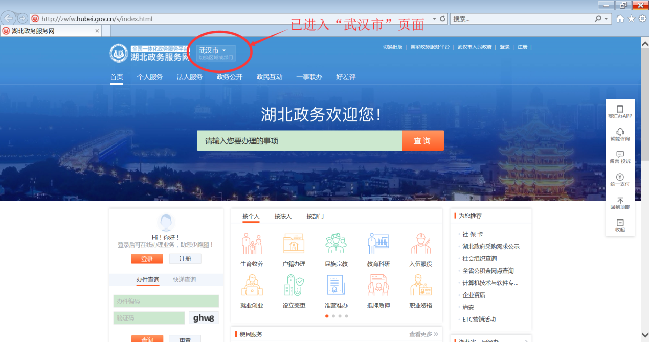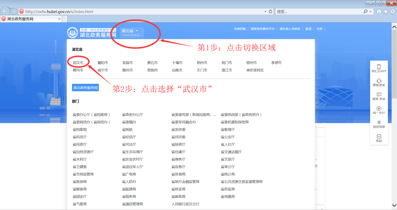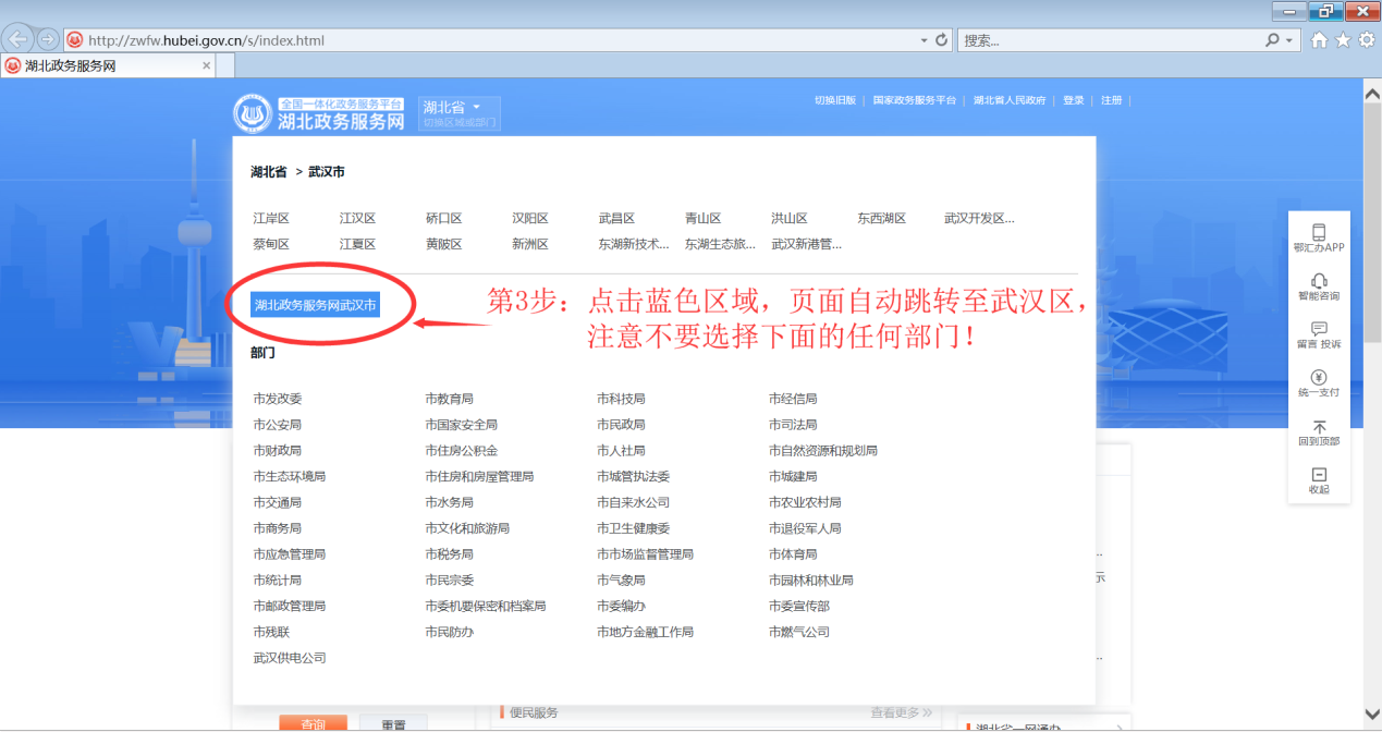 1.市民在市人社局官网“办事服务”页面点击“个人办事”、“单位办事”时,将自动跳转至湖北省政务服务网首页。在首页选择武汉市页面,具体操作步骤如下: