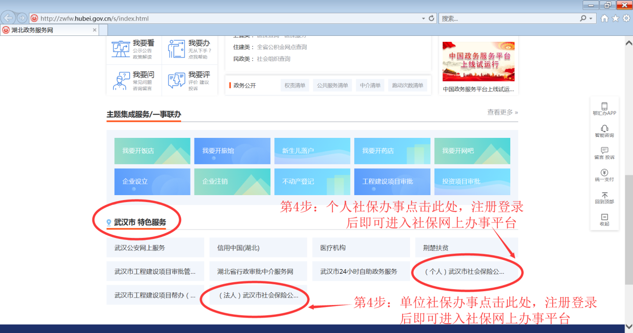 按照省政务办要求,武汉市人社局社会保险公共服务平台(参保人、单位)访问入口将整体迁移至湖北省政务服务网。为便于广大市民后续进行社保业务办理,现将新的访问路径提示如下: